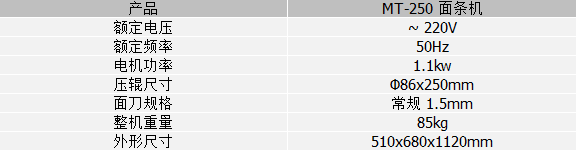 MT-250 面條機是我公司研制的高效率電動面條機,産品具有結構緊湊、性能穩定、操作方便、壓面厚薄均勻、切面清晰平整等優點;且符合國家衛生安全标準,适合酒店、賓館、飯店、超市、單位食堂、食品加工場等各類型場所制作面條之用。 産品參數