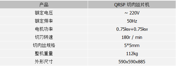 QRSP切肉絲片機是我公司精心設計和制造的食品機械。該産品可根據用戶需要加工各類肉片、肉絲等食材。設備切肉片厚度均勻,切絲條狀清晰,多規格切肉絲選擇,可裝拆式刀組;産品外型美觀,性能穩定,操作簡便,高效實用,且符合國家衛生安全标準,适用範圍廣。是賓館、酒樓、餐廳、單位食堂、肉食品加工企業以及市場商戶的理想幫手。 · 新穎外觀,安全可靠設計。 · 優秀不鏽鋼刀片、衛生耐用。 · 加工能力強。 · 可以訂造刀片的間距。 點擊觀看操作視頻 産品參數