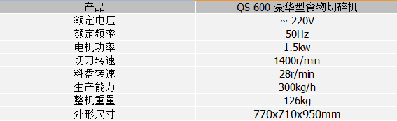 QS-600 豪華型食物切碎機是我公司精心設計和制造的食品機械,該産品可以将肉、瓜果、蔬菜等在料盤内通過一組高速旋轉的切刀進行反複循環切削。快速使食物切碎切細,實現用戶所需的用材和餡料(如餃子餡等)。本系列設備有座地式和台式可供選擇。産品性能穩定、結構合理、操作方便,易于清潔,外形美觀高雅;具有占地小,生産效率高的特點,代替傳統落後的手工切削制作,是食品加工企業加工食物餡料的理想設備。
