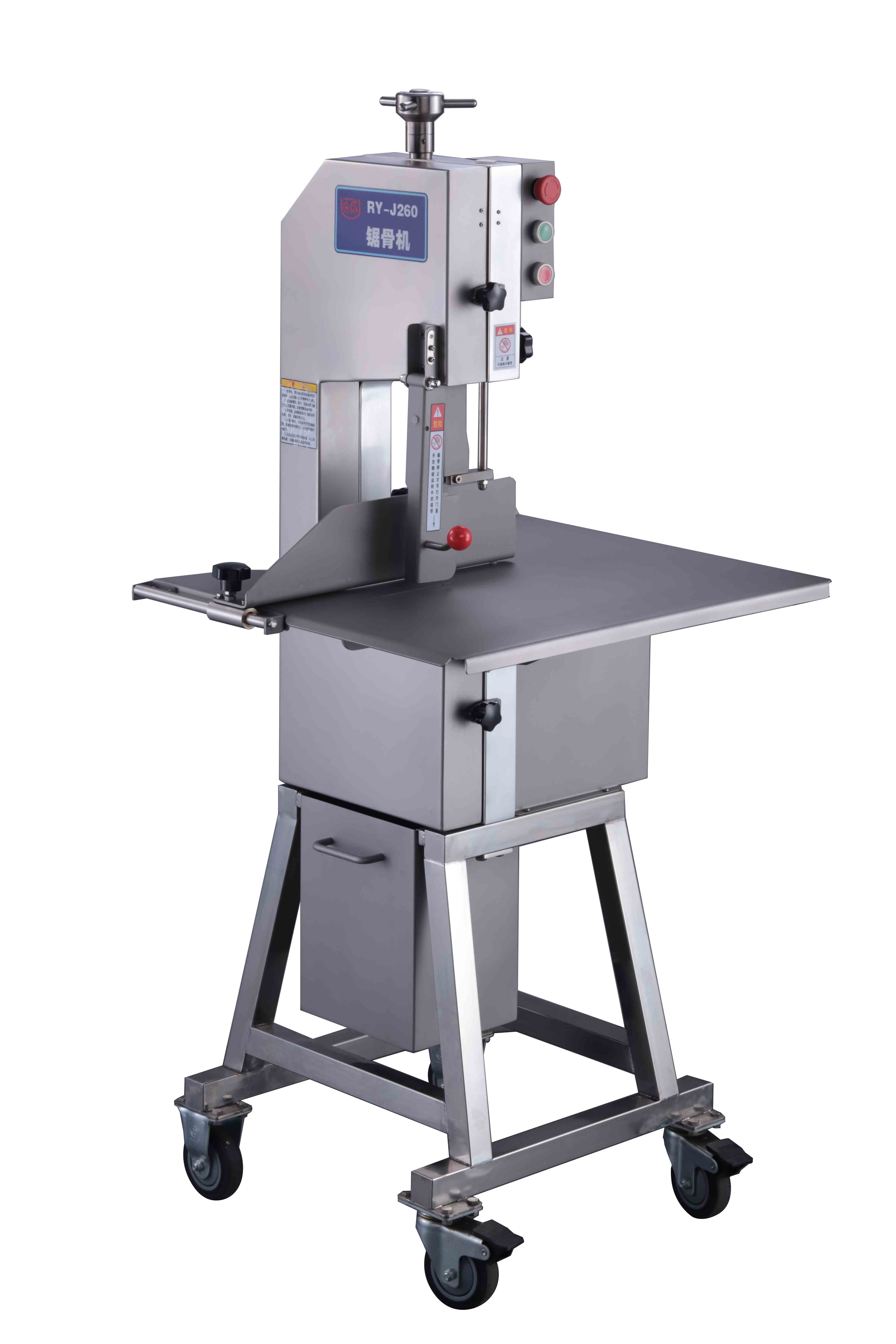 能加工各類骨頭、冷凍肉、冷凍魚等食材。上下挂輪采用不鏽鋼精鑄加工傳動平穩。鋸條調節把手限位式設計,可調節踞條松緊,便于拆裝。活動推杆,活動推肉闆能有效防止觸碰鋸條,符合安全。o滑動式或絲杆式擋闆定位調節機構,便于精準切割不同尺寸,RY-J350還可微調。
